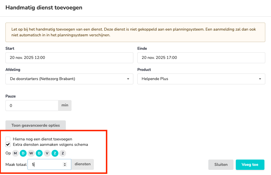 Klik op Extra diensten aanmaken volgens schema om in één keer een serie diensten toe te voegen.