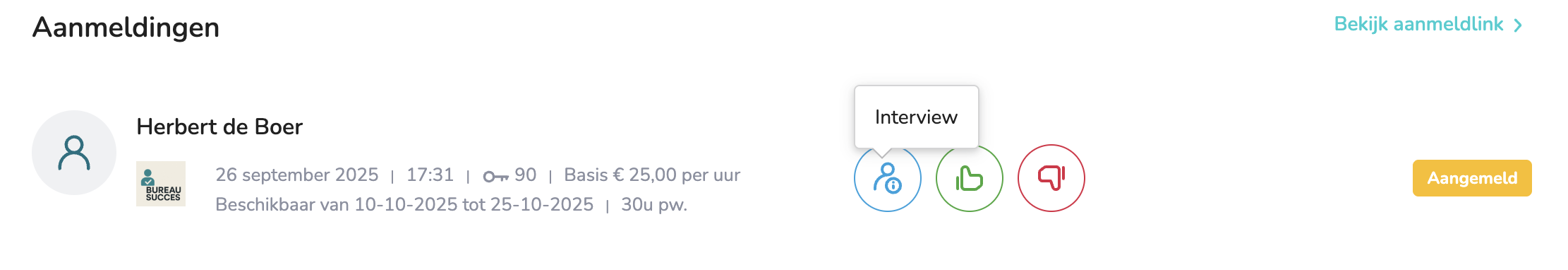 Wil je eerst meer weten over de sollicitant of overzicht houden van wie je wel of niet voor een kennismaking uitnodigt? Klik dan op de blauwe knop 'Interview'. Hieronder zie je hoe dit eruitziet in Elanza.