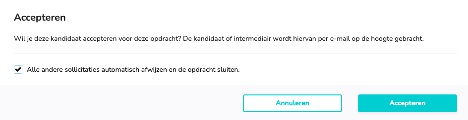- Meerdere kandidaten? Klik op Accepteren -> kies "Alle andere sollicitaties automatisch afwijzen en de opdracht sluiten" als je de rest wilt afwijzen