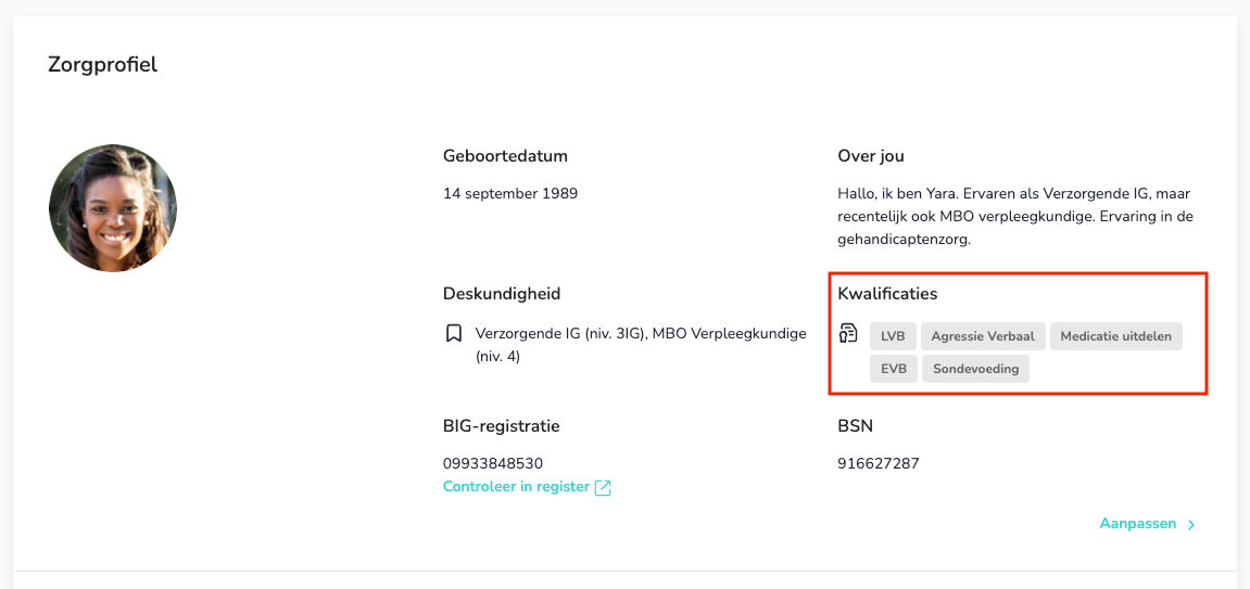 Met kwalificaties zet je zorgverleners doelgericht en met hogere kwaliteit in. De juiste zorgverlener op de juiste plek. Zo behoud je flexibiliteit en krijg je beter inzicht om weloverwogen beslissingen te nemen. Dat zorgt voor efficiëntere inzet en betere zorg.