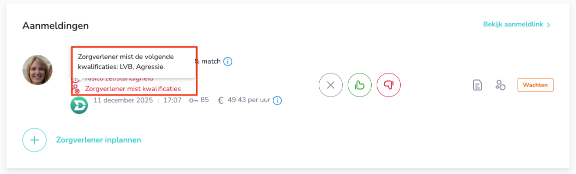 Let op: Waarschuwingen blokkeren de aanmelding niet. Controleer daarom altijd of een zorgverlener echt geschikt is voor de dienst.