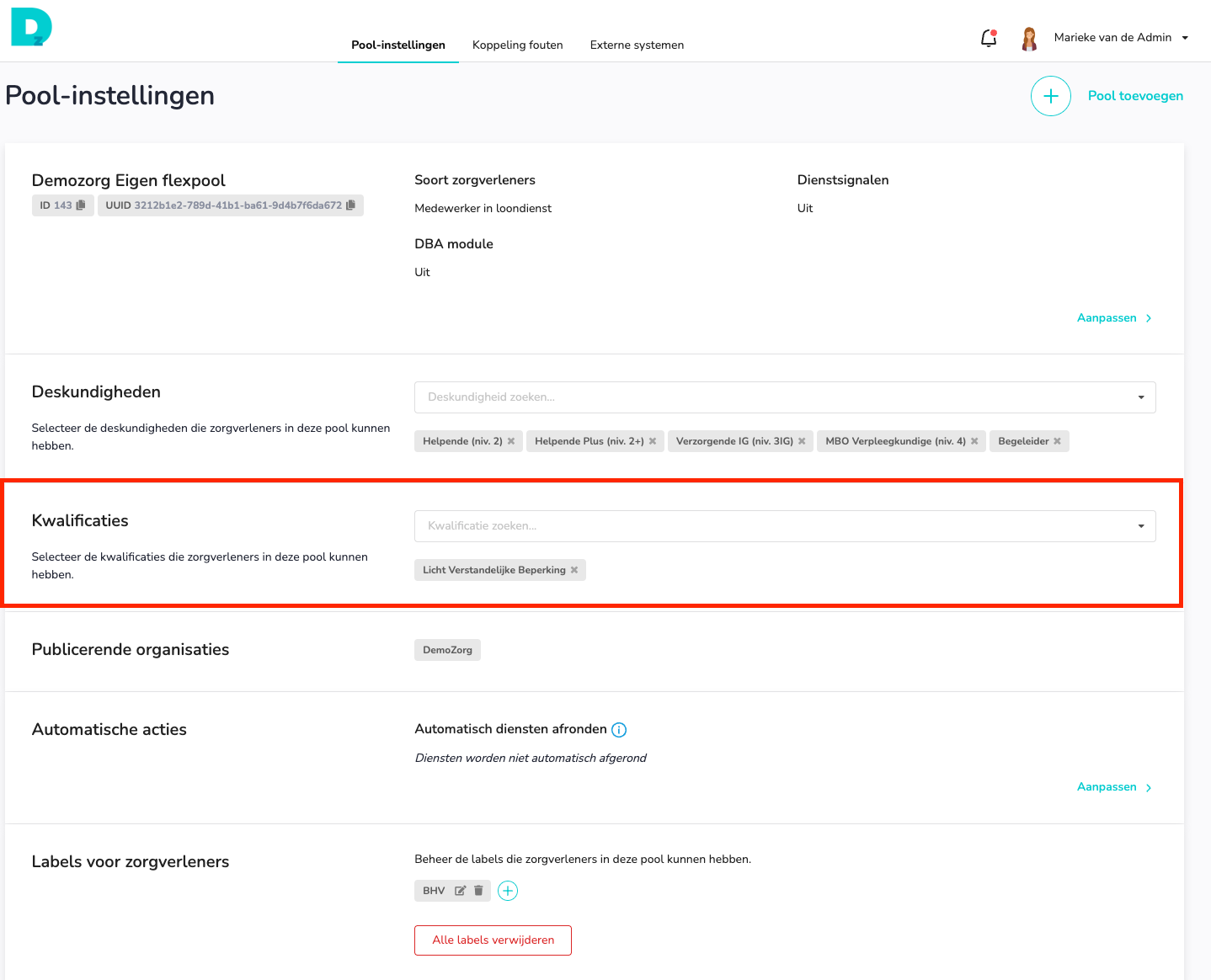 Als je direct extra kwalificaties wilt gaan gebruiken, dan moet je eerst kwalificaties toevoegen aan de zorgverleners pool. In de afbeelding hieronder zie je waar je de kwalificatie kan toevoegen aan de zorgverleners pool.